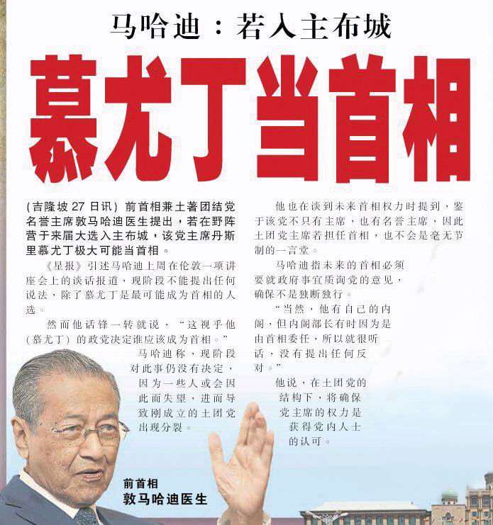 土著团结党在今年5月发布一项民调,显示该党主席慕尤丁是最受欢迎的“影子首相”人选。民调报告声称,37.3%受访者希望慕尤丁担任下一任首相。