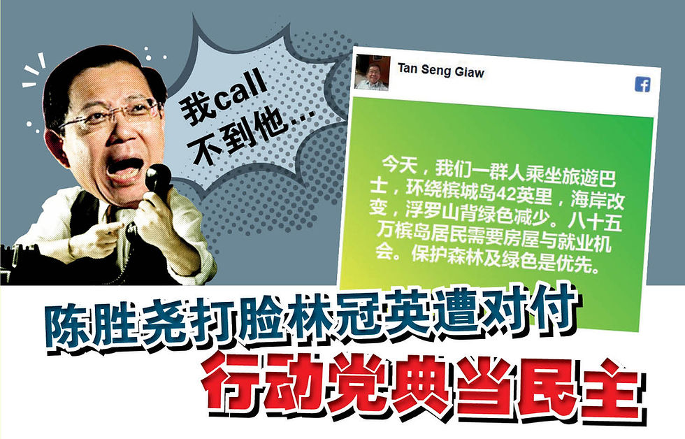 也是行动党甲洞区国会议员陈胜尧,在其脸书上针对槟州自然环境以三语发言,控诉槟州环境即将毁灭,但得不到林冠英的关注,但最终等到的却是林冠英的推搪,并转移视线表示将会在党内部处理。不但如此,林冠英同一个时间表示从年初开始就联络不上陈胜尧的言论颇有玩味。 相反地,陈胜尧也不是省油的灯,他的公开控诉颇有项庄舞剑的意思,他除了驳斥该党秘书长林冠英指该党在年初已与他“失联”的说法,还语带讽刺的表示,除非他正使用手机,否则绝不会联络不上他并强调,他会回复所有来电。