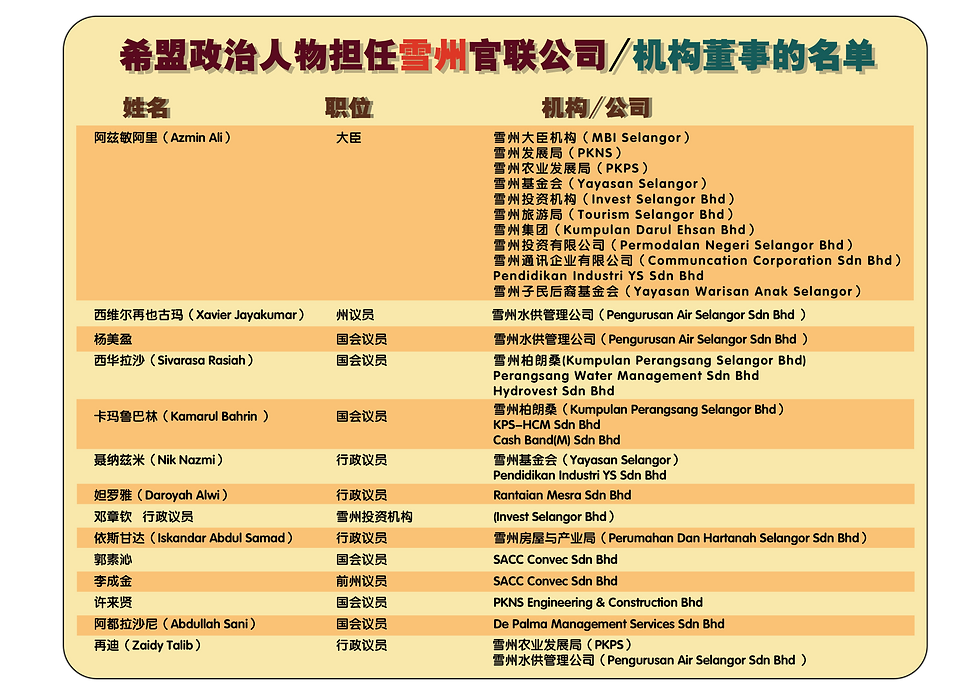 他通过委任公正党和行动党领袖如西华拉沙(Sivarasa Rasiah)、卡玛鲁巴林(Kamarul Bahrin )、杨美盈和郭素沁等担任官联公司的高职(见图1),以及间接持有一些公司如雪州集团(Kumpulan Darul Ehsan Bhd)及雪州柏朗(Kumpulan Perangsang Selangor)的股份,近乎控制了州内的企业和社企。通过掌控这些媒体、教育和公益机构,阿兹敏被视为借此来谋取政治利益!